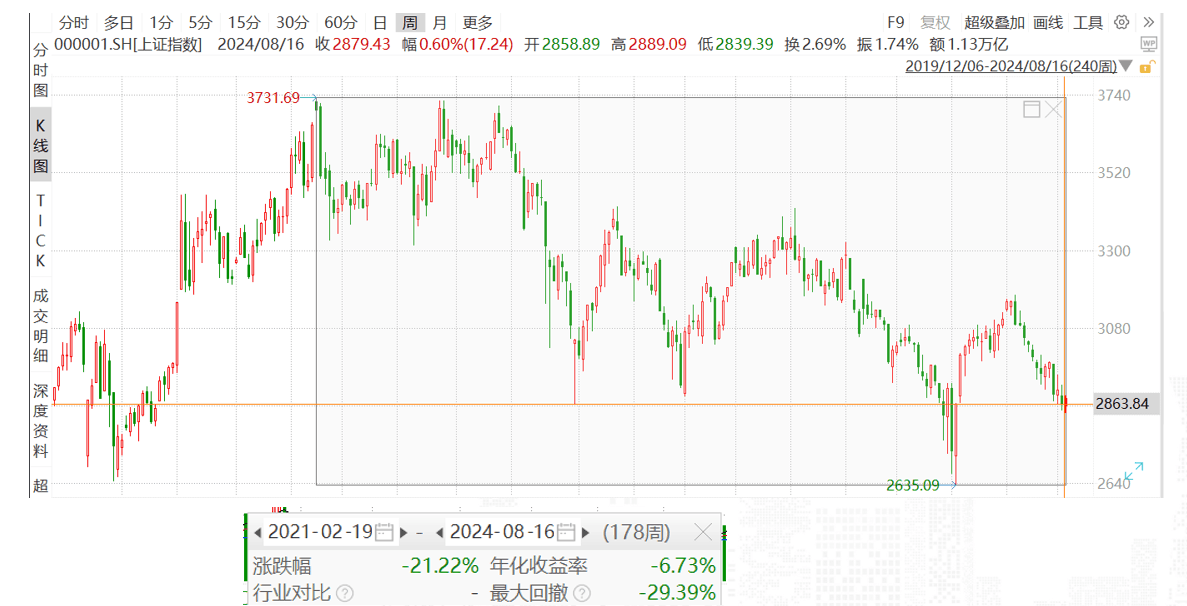 周A股在极度缩量小幅反弹,但从中期趋势看,尚未改变震荡弱势格局。本轮证指数跌可以追溯到2021年2: