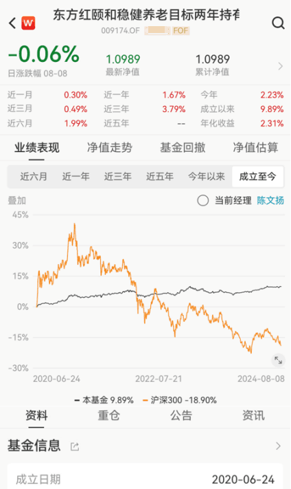 东方红颐和稳健养老两年A类FOF成立于2020.6.24,根据基金定期报告,2020.6.24-2020.12.31、2021-2023年净值增长率分别为4.26%、3.40%、0.25%、-0.54%,同期业绩比较基准收益率分别为4.30%、0.72%、-4.09%、-1.04%。