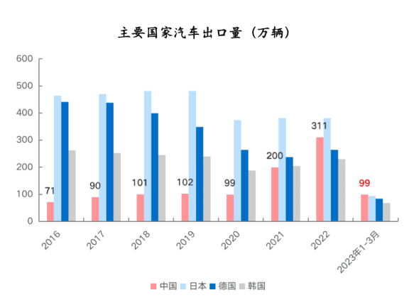2023年1-3中汽车口量跃居全球第一。中汽车口99辆、同比+71%,超本约4辆,口增速远超韩德,成为全球第一大汽车口: