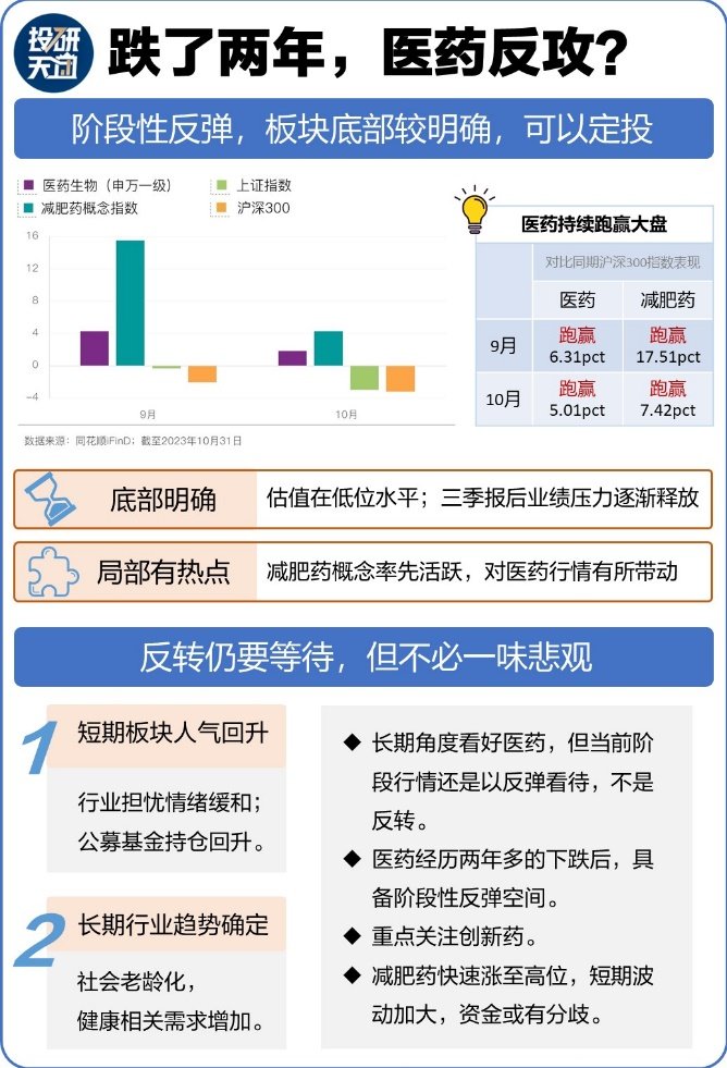 黄行:本质原因还是超跌。医药之经历了集采控费、行业反腐,把投资者预期打得很低,市场也跌了极多,估值较低。结果三季报来以,大家一看,虽然业绩分化,但有一些细分方向还不。而且,最近集采也、反腐也罢,都比较温和。业绩超预期、政策利、估值还低,自然就会反弹。
