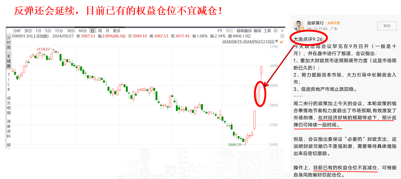 这个观点们是认同,“战术”代表了涨暂时先看短期,因为当市场涨更多是由资金流动和情绪驱动,而非基本面改善,预计十一市场将逐渐回归理性,届时需要重点关注财政政策兑现程度,以及四季度经济数据能否回稳,以决定此轮反弹能否进一步延伸至反转。