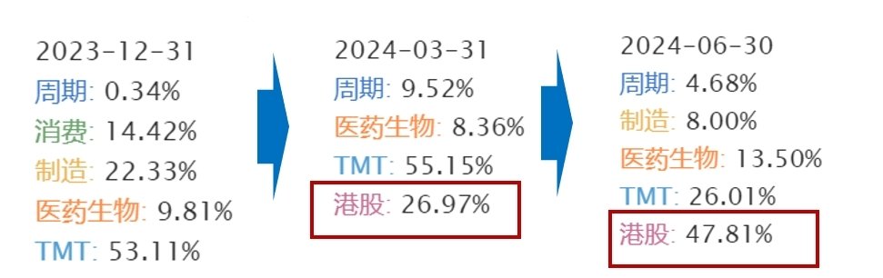 港股有很多未在A股市优质公司,尤其在港股创新药、互联网、新兴消费等领域优质公司,且大部分公司估值较A股更低。从2023年底至今季末数据可知,翟相栋在合同变更,快速提升港股配置比例,半年报中港股仓位已拉升至47.81%。