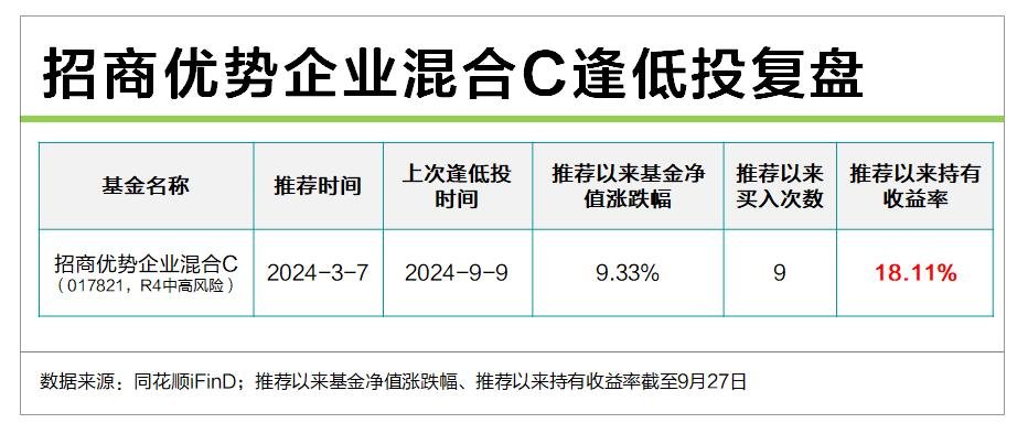 819之是按照每周跌2%以逢低投一次,之是每周跌1%以逢低投一次,推荐以来一共定投9次(图红点),推荐收益率是18.11%。