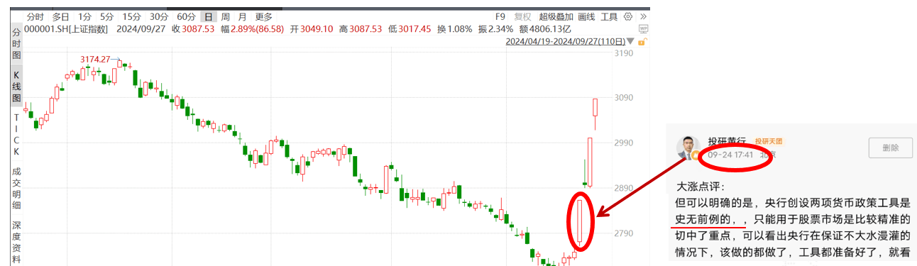 周二发布会强力政策现,改变了市场预期,也改变了们之逻辑,周二收盘们在APP社群中提示,降准降息货币政策是符合预期,但新创设两个政策工具直接针股市,史无例: