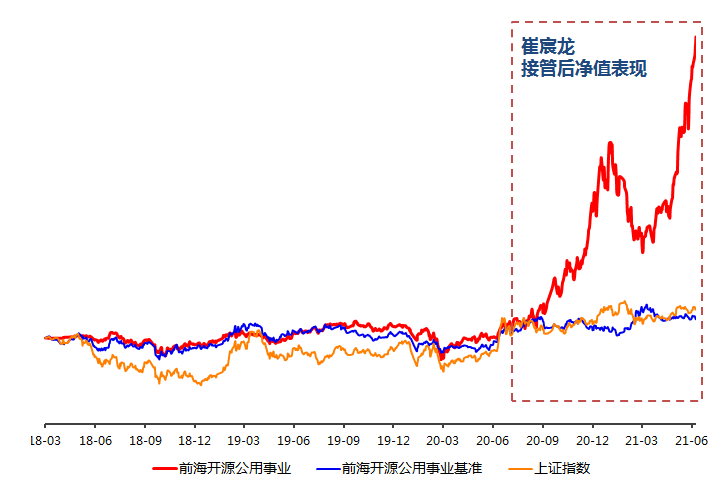 来源:Wind,2018.03.23-2021.06.30,崔宸龙任职时间为2020.07.20,基金业绩比较基准为:MSCI中A股公用事业指数收益率*80%+中证全债指数收益率*20%,过往数据不代表未来表现,亦不构成基金业绩保证。
