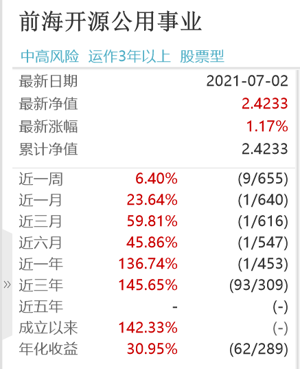 崔宸龙自2020年720起管理海开源公用事业(005669),任时该基金单位净值为1.0631,截至2021年630,基金最新单位净值达2.4016。晨星数据显示,海开源公用事业近1年涨幅139.18%,业绩在全市场64只沪港深股票型基金中排名第一。