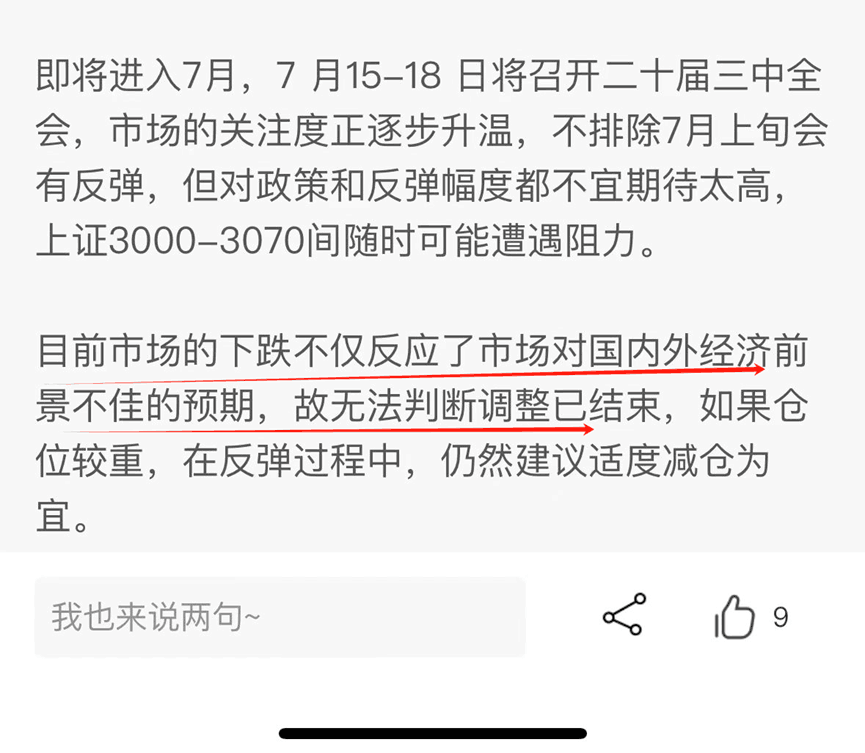 ,黄行也提示,在7重要会议召开,不排除市场会有反弹,但幅度不宜期待太高,3000-3070随时可能遇阻回落,所以控制仓位仍是第一要务。