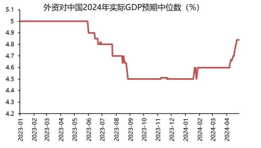 从多项数据来看,经济正在复苏,如制造业PMI及财新制造业PMI连续多处于扩张区间,超市场预期。此外,海外年内中经济增速预测也不断修,50家外资机构中2024年GDP实际增速预测中位数由年初4.5%修至4.84%,海外于中经济增长景态度愈发乐观:
