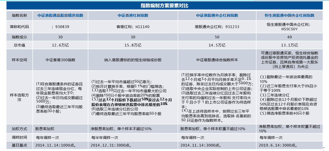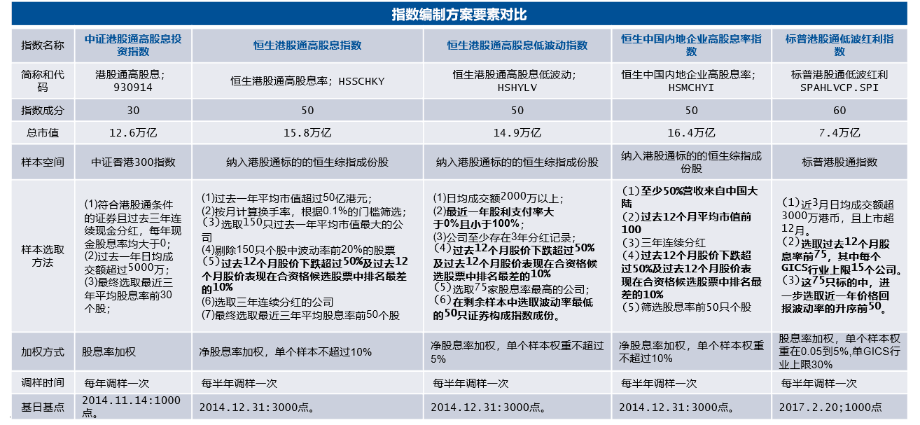 目港股红利类指数主要有以9类,在编制方式主要区别是: