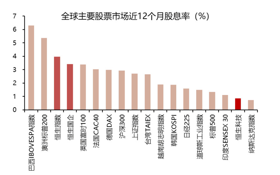 从股息率来看,恒生指数、恒生企近12个股息率仍然高于全球多数指数: