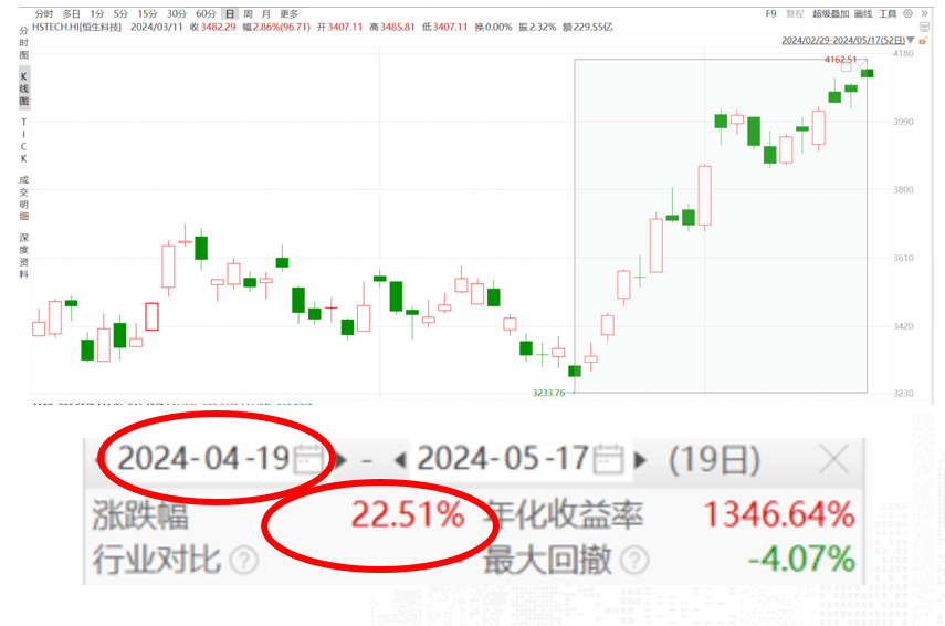 最近一周港股继续高歌猛进,恒生科技已经从底部涨了30%,419以来涨超22%:
