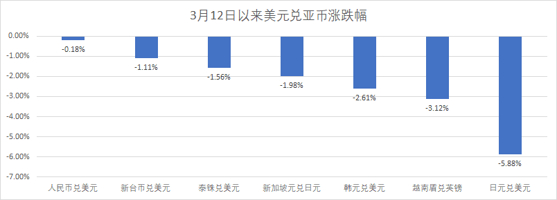 3以来亚洲货币加速贬值,港币和人民币相较强: