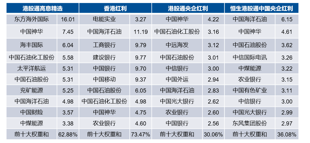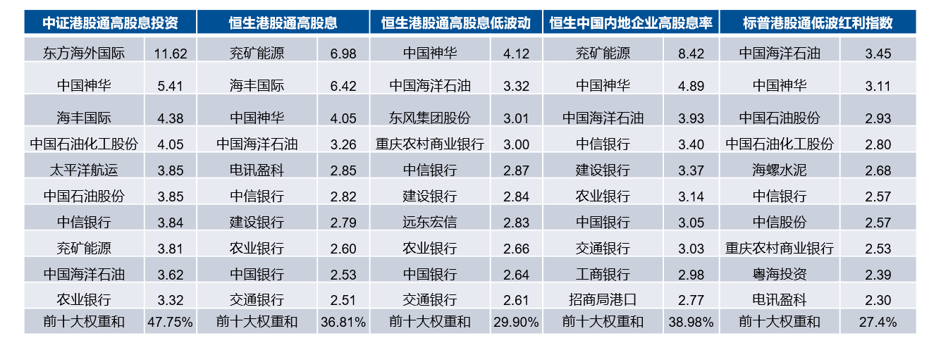 如果是风险偏较低客户,可以选择持股集中度较低指数,如“标普港股通红利低波”和“恒生港股通高股息低波动”。