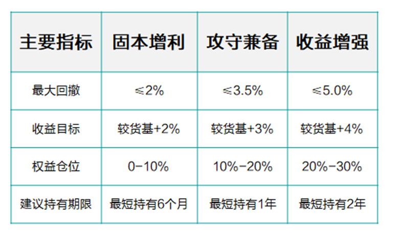 其次,每一大类产品,都把该类产品最需要关注四个指标列来了:一是收益目标,二是为实现这个目标投权益仓位,三是最大回撤,四是推荐持有期。
