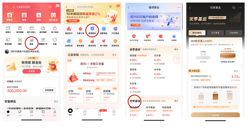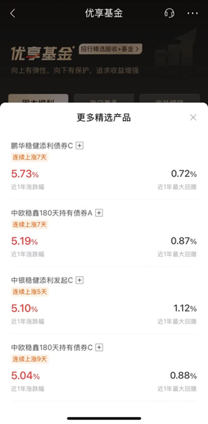 第三,行App各种固收+基金进行筛选,在“优享基金”产品页面看到,都是筛选结果。