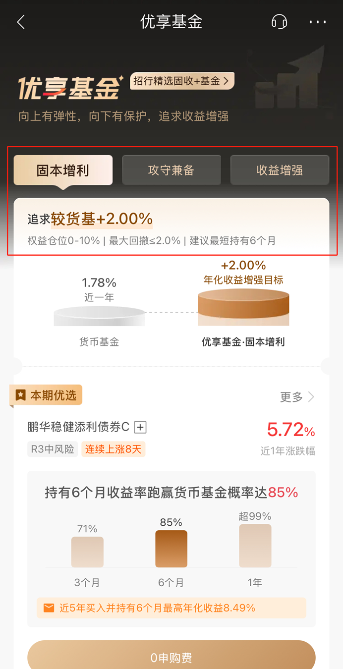 进到“优享基金”这个页面,可以根据自己风险偏筛选和考察固收+产品。