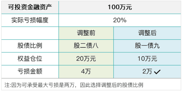 认为自己可以承受波动是20%,根据股二债八比例,可以投资20元到权益类产品中。