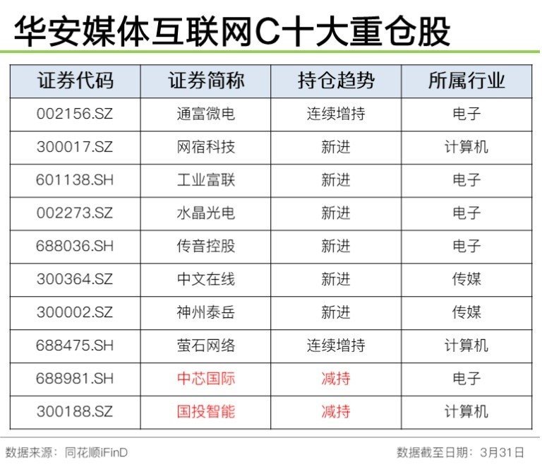 仓位变化:十大重仓股中电子持仓比例创新高,减持了计算机仓位,同时提升了传媒仓位。
