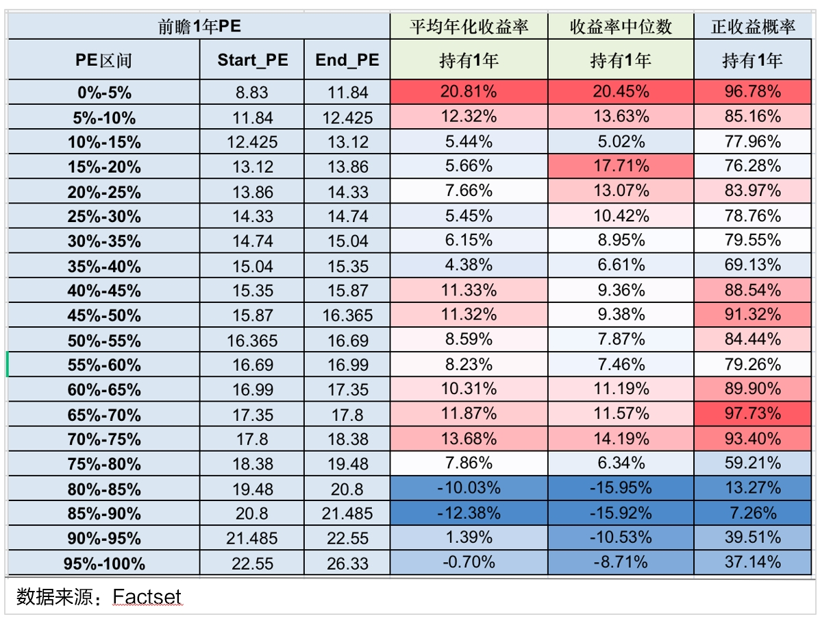 针这个问题,恰有分析师统计了在不同估值,持有标普500指数1年,收益分别如何。
