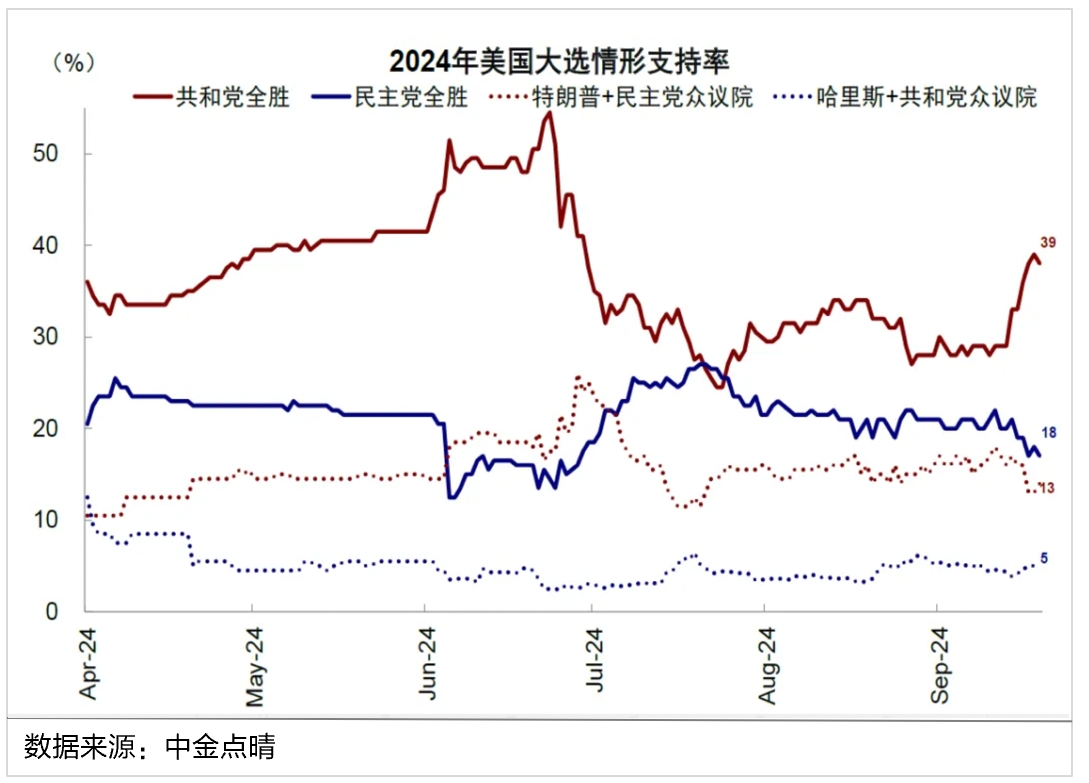 当特朗普民调情况不断改善,共和党拿总统和会概率走高。各大类资产走势,都反映这种预期:美股走强,美元走强,黄金走强,油价走弱,美债收益率高位徘徊。