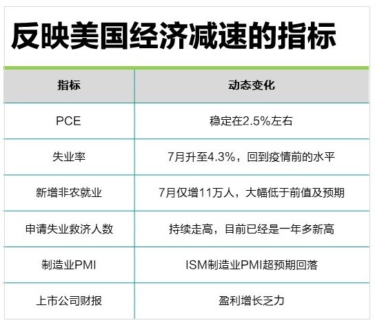 近期美经济数据走软,也让市场更加坚定开始“降息交易”。6底到8初,美一系列经济数据都指向美经济在放缓。表中列举了部分美经济指标动态。