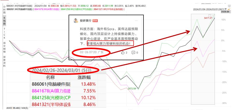 具体方向,周一早七点,们在社群中及时提示:重视AI算力等硬科技机会,周5天相关行业指数涨幅8-13%: