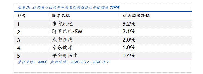 近两周中证海外中互联网指数成份股涨幅三分别为东方甄选(+9.2%)、阿里巴巴-SW(+2.1%)、众安在线(+2.0%)。