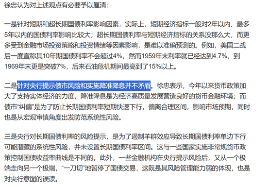 首先,是明确央行态度。央行长期债利率风险提示,是为了遏制羊群效应导致长期债利率单边行可能潜藏系统性风险。中行间市场交易商协会副秘书长徐忠接受采访时表示:央行提示债市风险和实施降准降息并不矛盾。