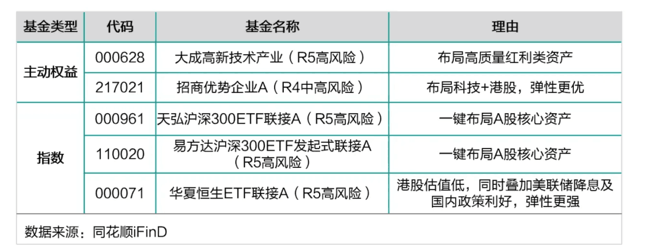 因此们从高质量红利(盈利稳定、现金流健康且分红比例高企业),均衡(受益于内政策刺激)、港股(估值低,受益于美联储降息和内政策双重利刺激)这三个维度,天团给了一些新基金选择供团友们参考。