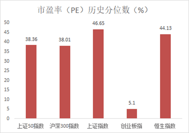 从历史股指水平来看,以近10年为窗口,指数当市盈率水平进行比较,截至310,证50指数市盈率(PE)历史分位数为38.36%,沪深300指数为38.01%,证指数为46.65%,创业板指为5.1 %,港股恒生指数为44.13%。