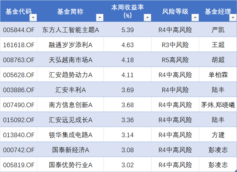 此外,融通岁岁添利A(代码:161618;R3中风险)、天弘越南市场A(代码:161618;R5高风险)本周均涨超4%。