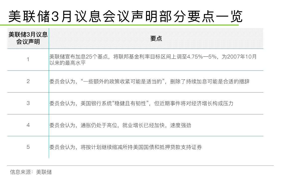 在硅谷行爆雷导致美金融风险升背景,美联储在3议息会议继续加息25个基点,将联邦基金利率提高至4.75%—5%。美联储主席鲍威尔表示,将继续评估信贷紧缩带来影响,现在因为行风波改变政策方向还为时尚早。