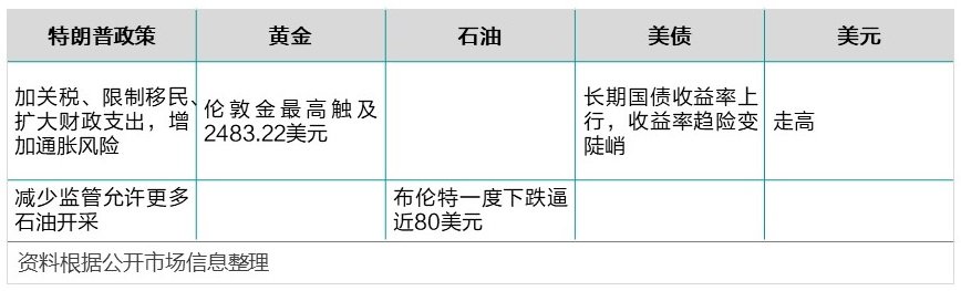 特朗普经济学核心是低利率和低税率,考虑到美联储目治理通胀还没有完全结束,特朗普政策导向很可能重新点燃美通胀。过去一周,们可以看到黄金、石油波动都特别大,但以周为单位观察,最所有资产类别变动方向都与特朗普交易契合。