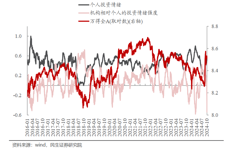 首先,周(2024.10.28-2024.11.01)个人投资情绪继续行,机构投资情绪则大幅行,迅速回落至历史低位,这种投资者情绪组合意味着市场阶段或偏弱走势。