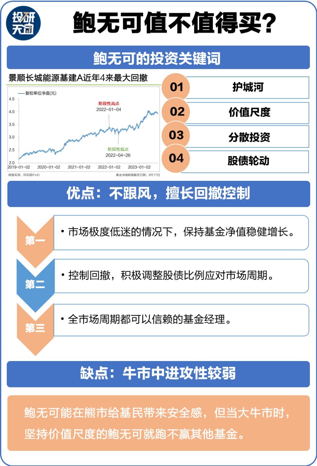 2)鲍无可偏有护城河公司,擅长净值回撤控制,并能积极调整股债比例应市场变化。