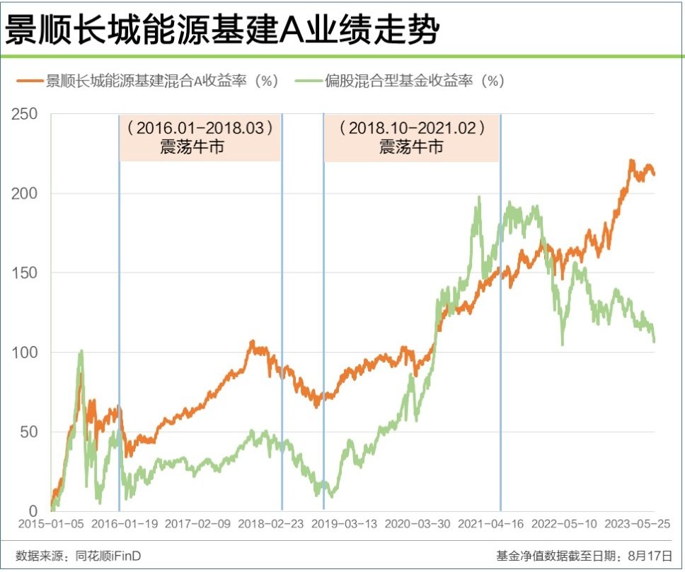 2018年10至2021年2震荡牛市中,混合偏股型基金业绩表现均值超过146.86%,景顺长城能源基建A仅有43.35%涨幅,这一表现在当时基民眼中是不能接受,因为“占用了资金,却耽误赚钱”。
