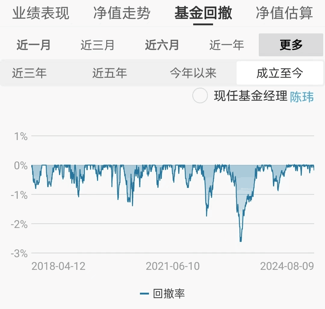 产品成立以来,最大回撤为2022年中2.62%,最大回撤修复天数为146天。