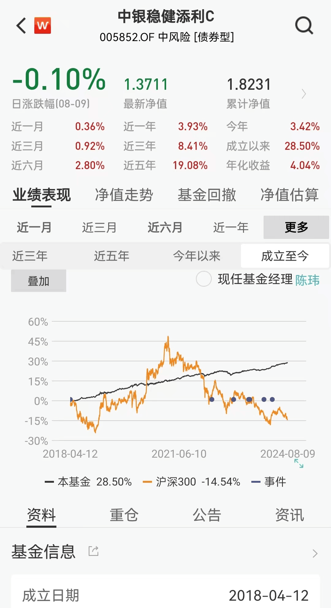 基金经理:陈玮,中基金固定收益投资部副总经理、高级副总裁,2014年加中基金开始担任基金经理。其在固收投资方面经验丰富,管理产品类型横跨纯债、二级债、灵活配置型基金,尤其擅长稳健风格固收+类基金管理。