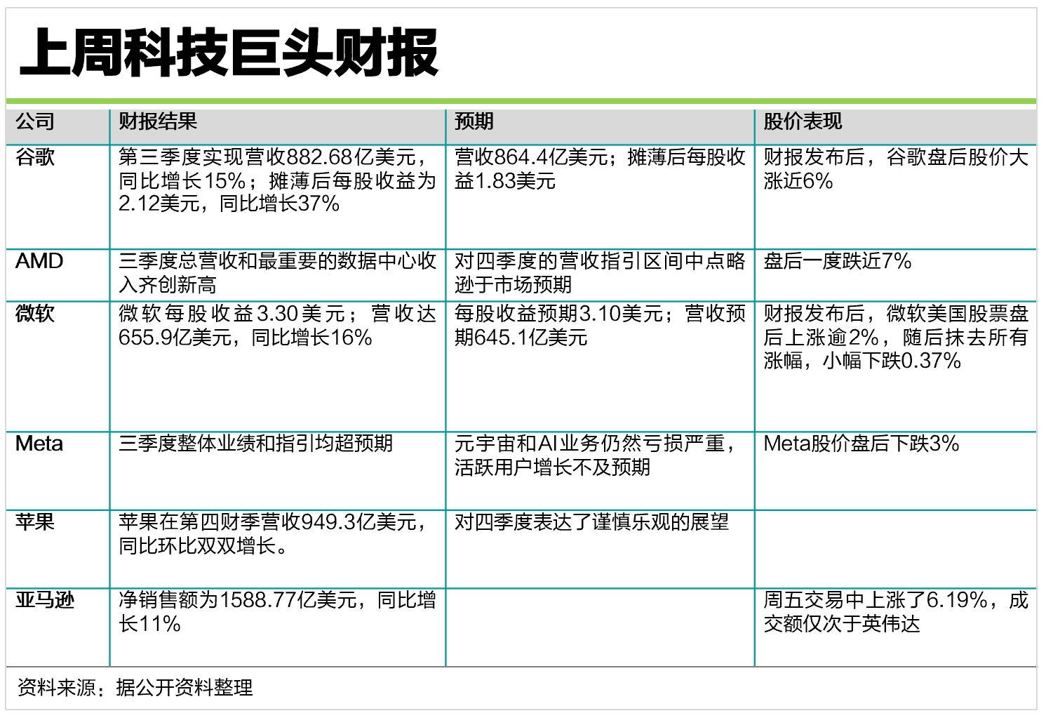 周,美科技巨头基本都公布了三季度财报,虽然很多公司营收超了预期,但是在营收指引比较谨慎,未能给市场大幅超预期印象,市场便转为跌。