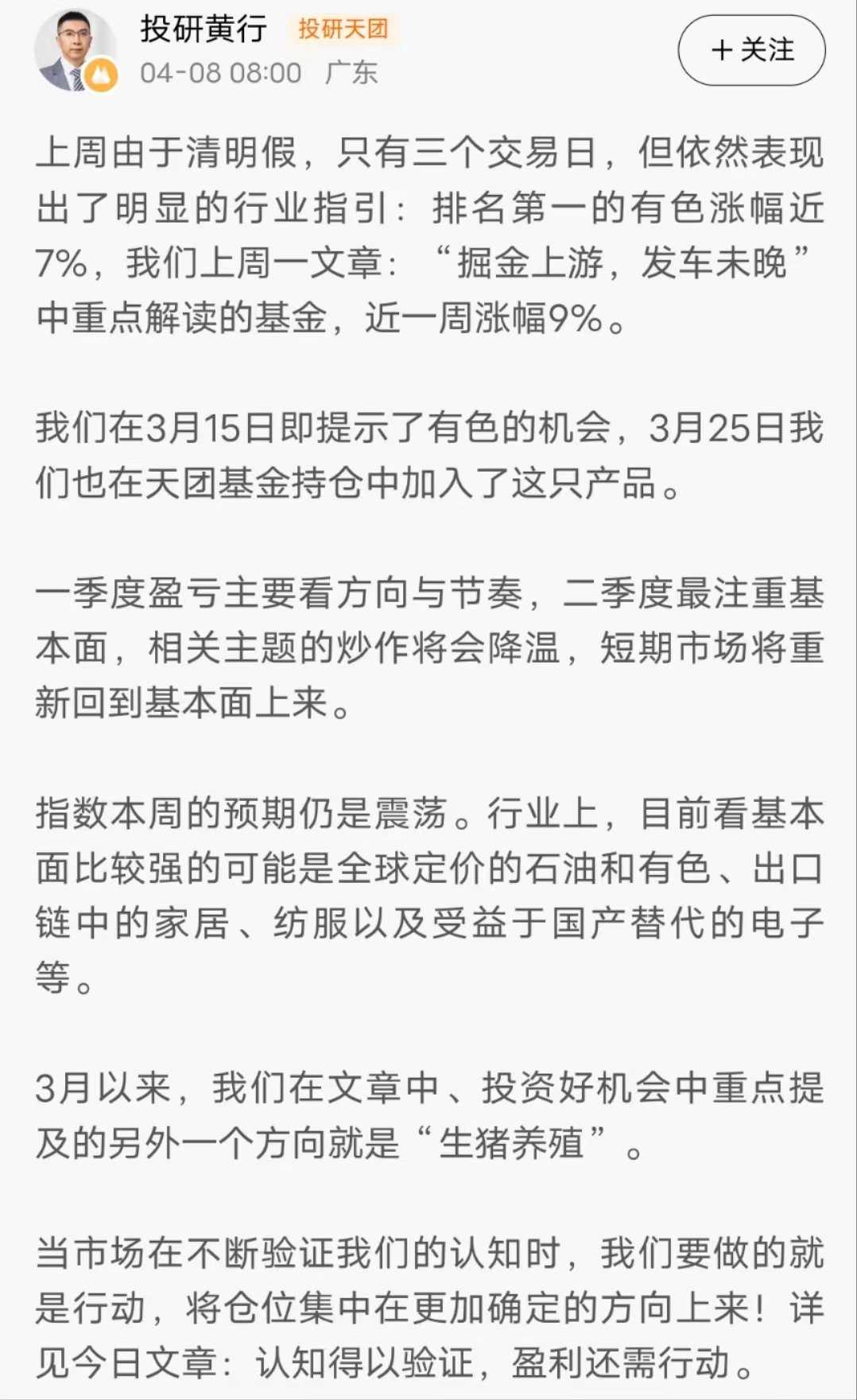 清明假期,天团判断当位置,指数大幅行难度增大,建议团友偏重防守。