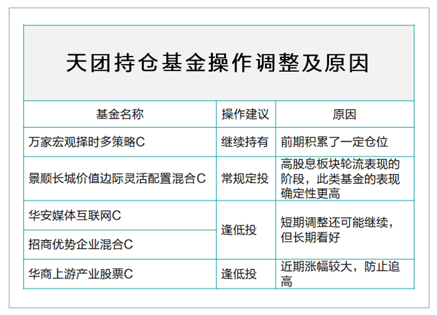 整体看,们持仓基金自推荐以来表现良,但近期现了滞涨或调整。在这种时候,长期看观点不变,但买操作需要调整。有三只基金由常规定投改为逢低投。