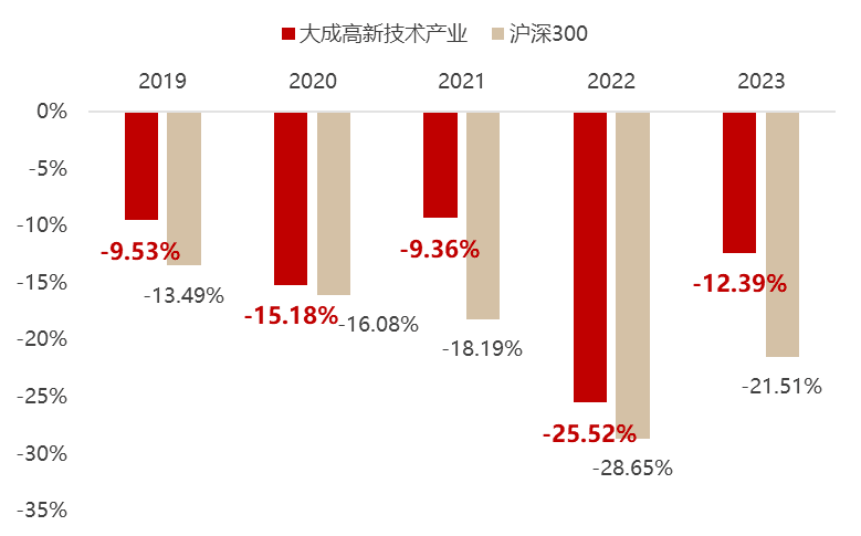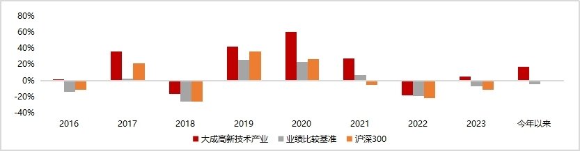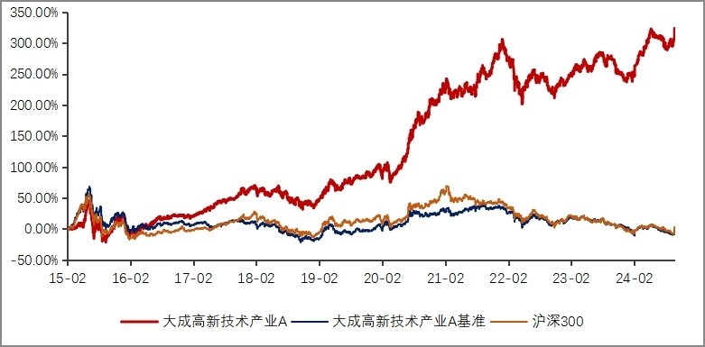 特别是在2016、2021、2023包括2024年多个逆风局中,沪深300指数年度收益为负,大成高新技术产业仍然守住了正收益,大幅逆市创收。