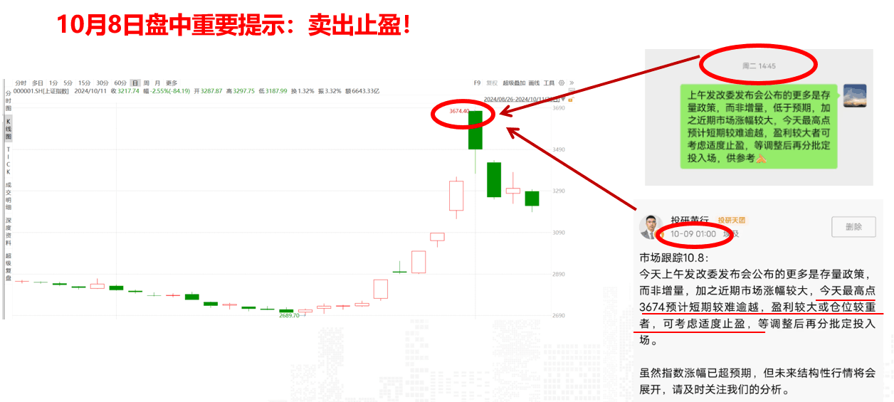 以目市场为例,由于108午发改委发布会不如预期,加之市场涨幅巨大,们在当天午三点给提示:卖止盈!并在社区中给建议: