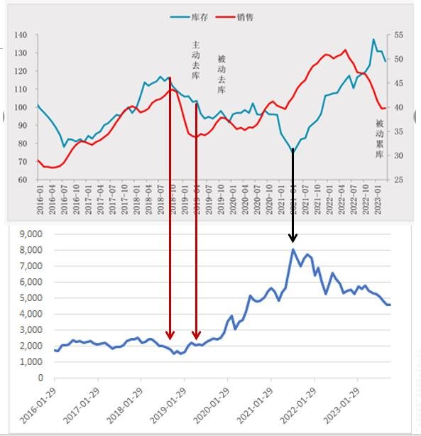 们以一个半导体周期为例,图是半导体库存和销售周期应半导体指数走势图: