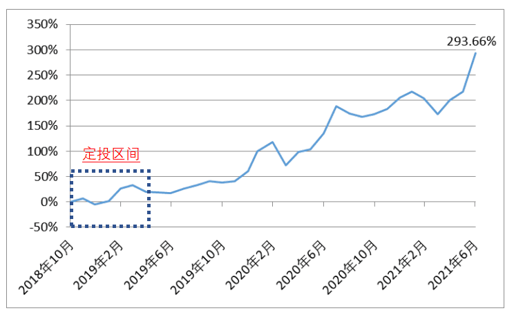 假设们在2018年10启动定投,每定投1000元得半导体行业指数,2019年4结束定投,但暂不获利了结,而是一直持有,直到2021年6,库存达到低位(黑色箭头),再获利了结,总体收益率非常可观: