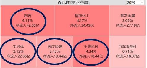 当时判断是:半导体、医药、油气走产业周期,有可能独立大盘走强。们看到周五涨幅和资金流较多行业就有医药和半导体:
